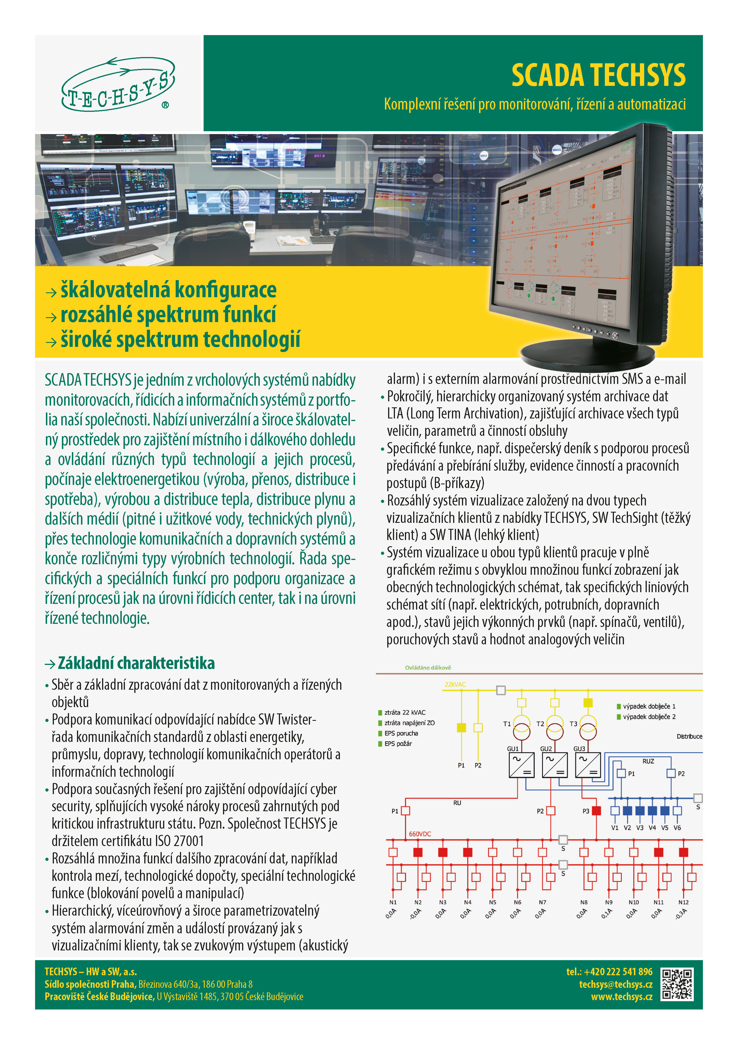 SCADA TECHSYS je jedním z vrcholových systémů nabídky monitorovacích, řídicích a informačních systémů z portfolia naší společnosti. Nabízí univerzální a široce škálovatelný prostředek pro zajištění místního i dálkového dohledu a ovládání různých typů technologií a jejich procesů, počínaje elektroenergetikou (výroba, přenos, distribuce i spotřeba), výrobou a distribuce tepla, distribuce plynu a dalších médií (pitné i užitkové vody, technických plynů), přes technologie komunikačních a dopravních systémů a konče rozličnými typy výrobních technologií. Řada specifických a speciálních funkcí pro podporu organizace a řízení procesů jak na úrovni řídicích center, tak i na úrovni řízené technologie.